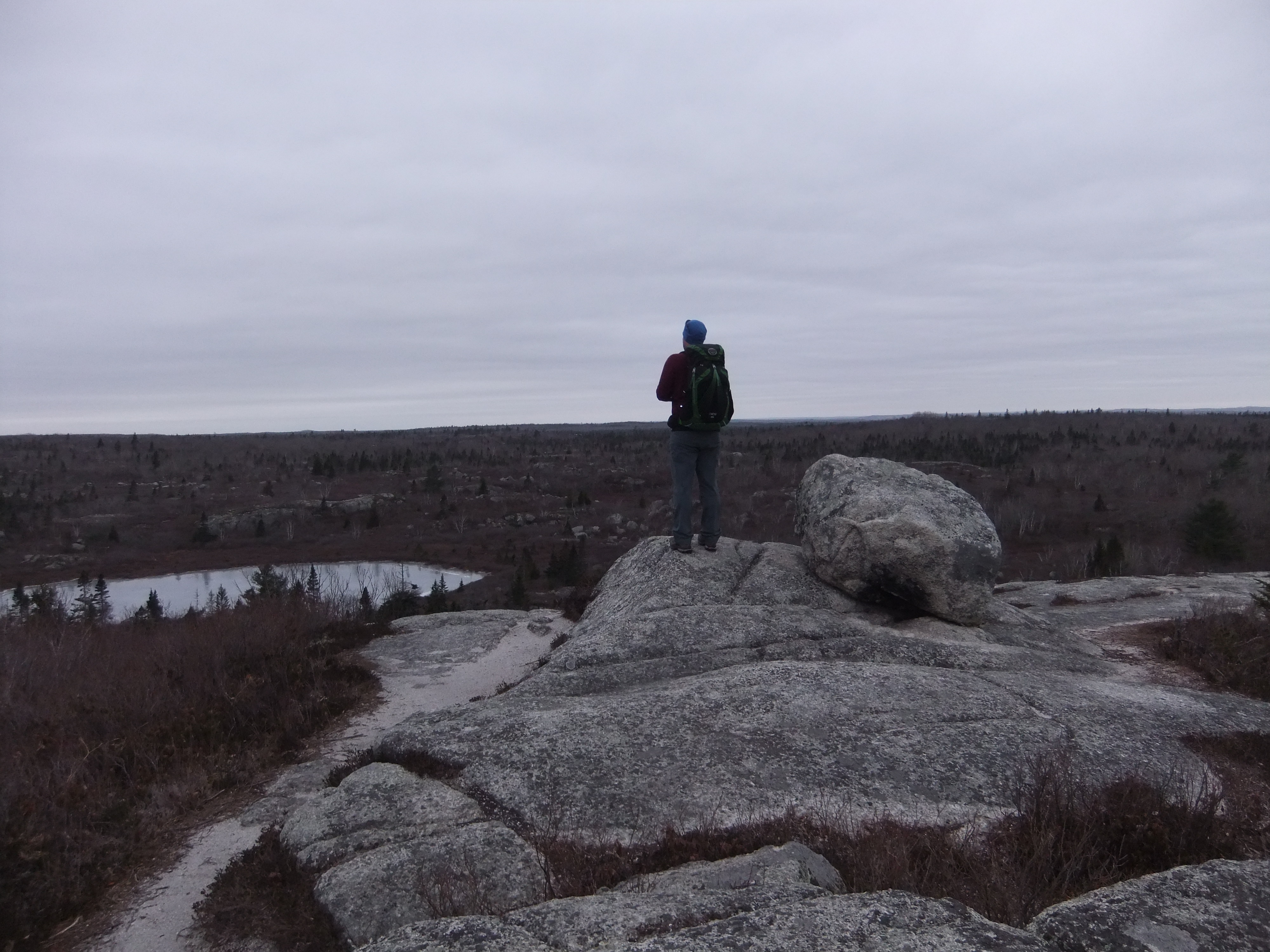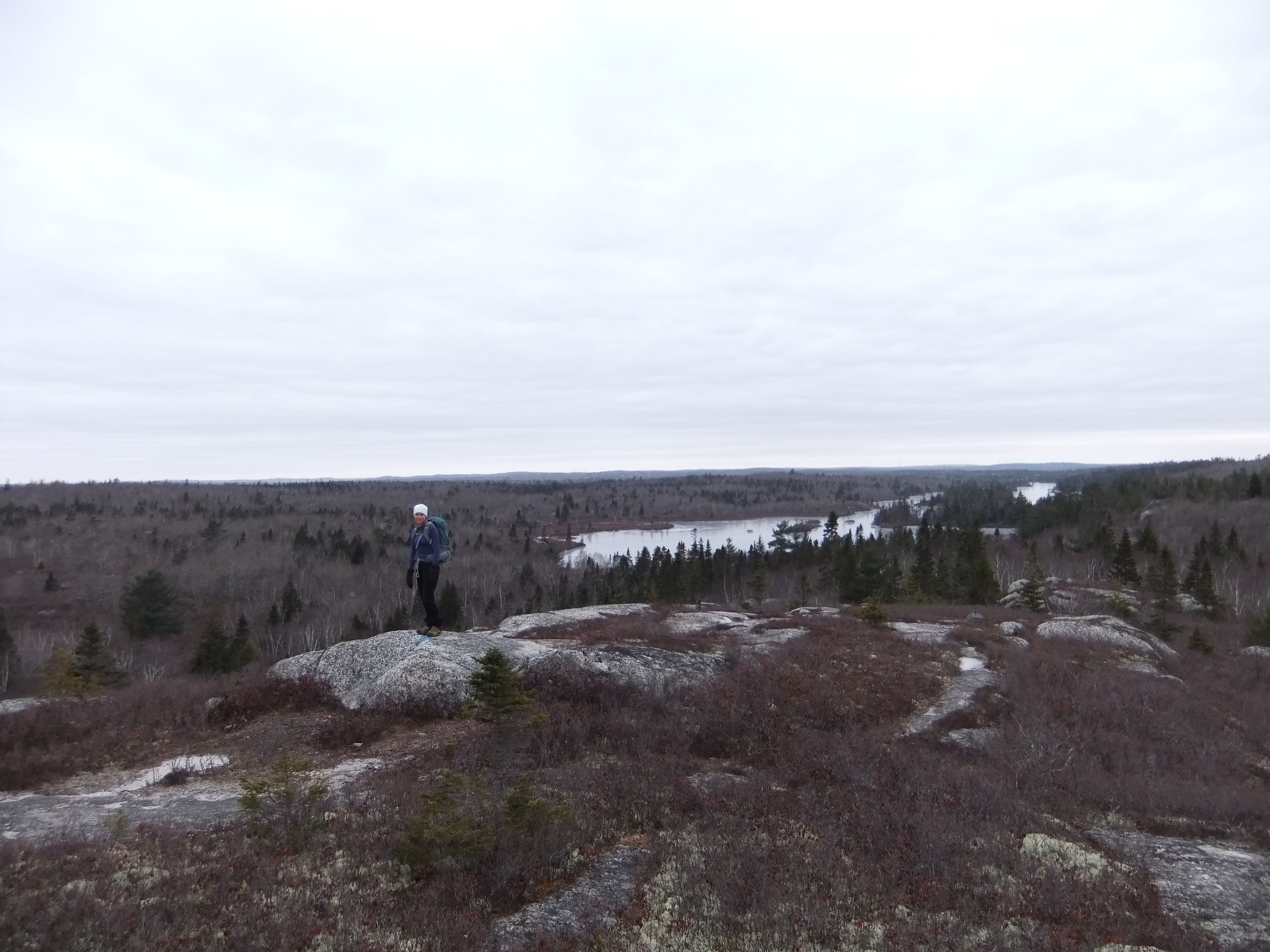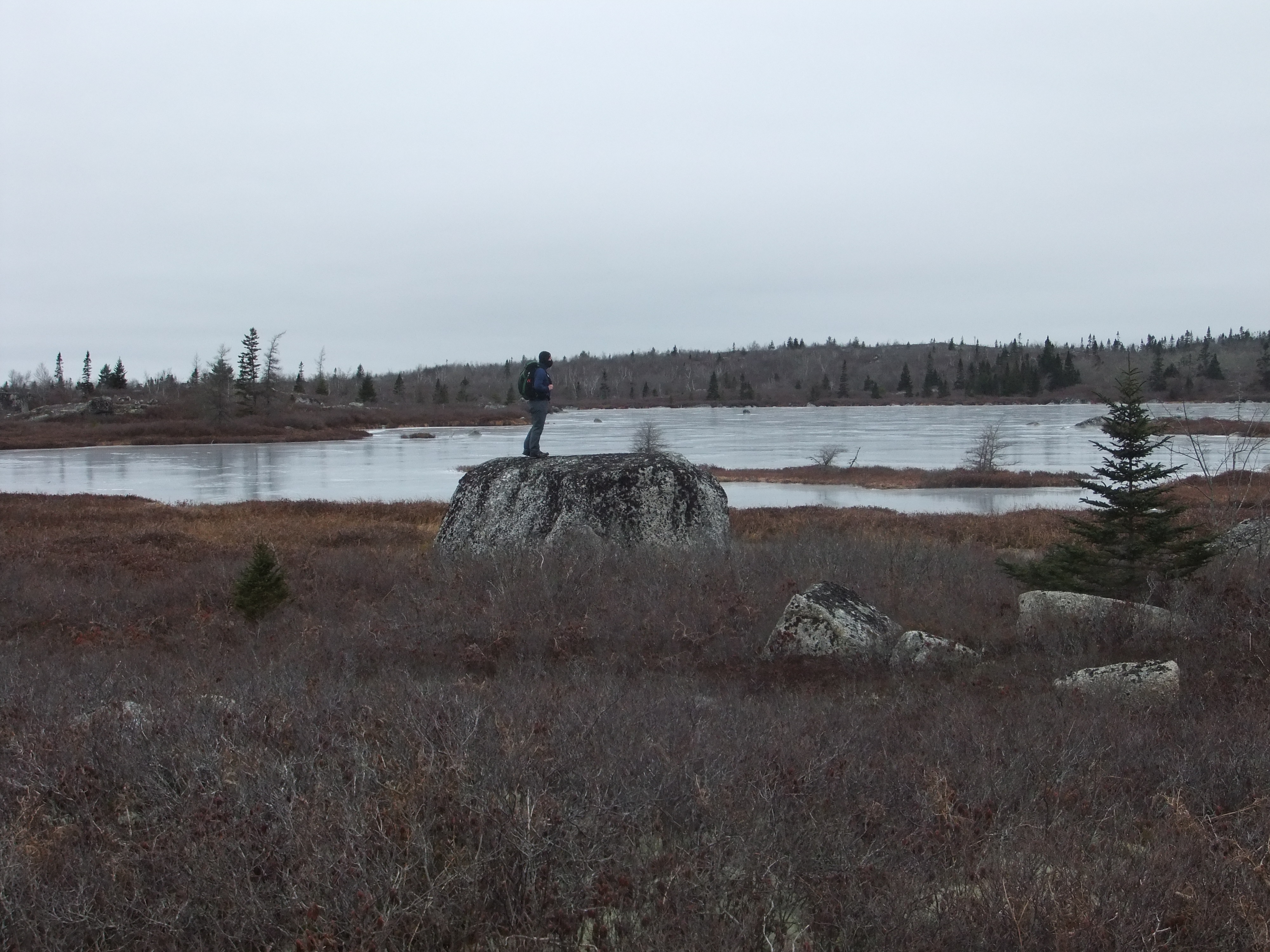 Heading back, we stopped for Wade to climb up on the rock overlooking Upper Marsh Lake. This area was more exposed and the balaclava was protection against the bitter cold wind.