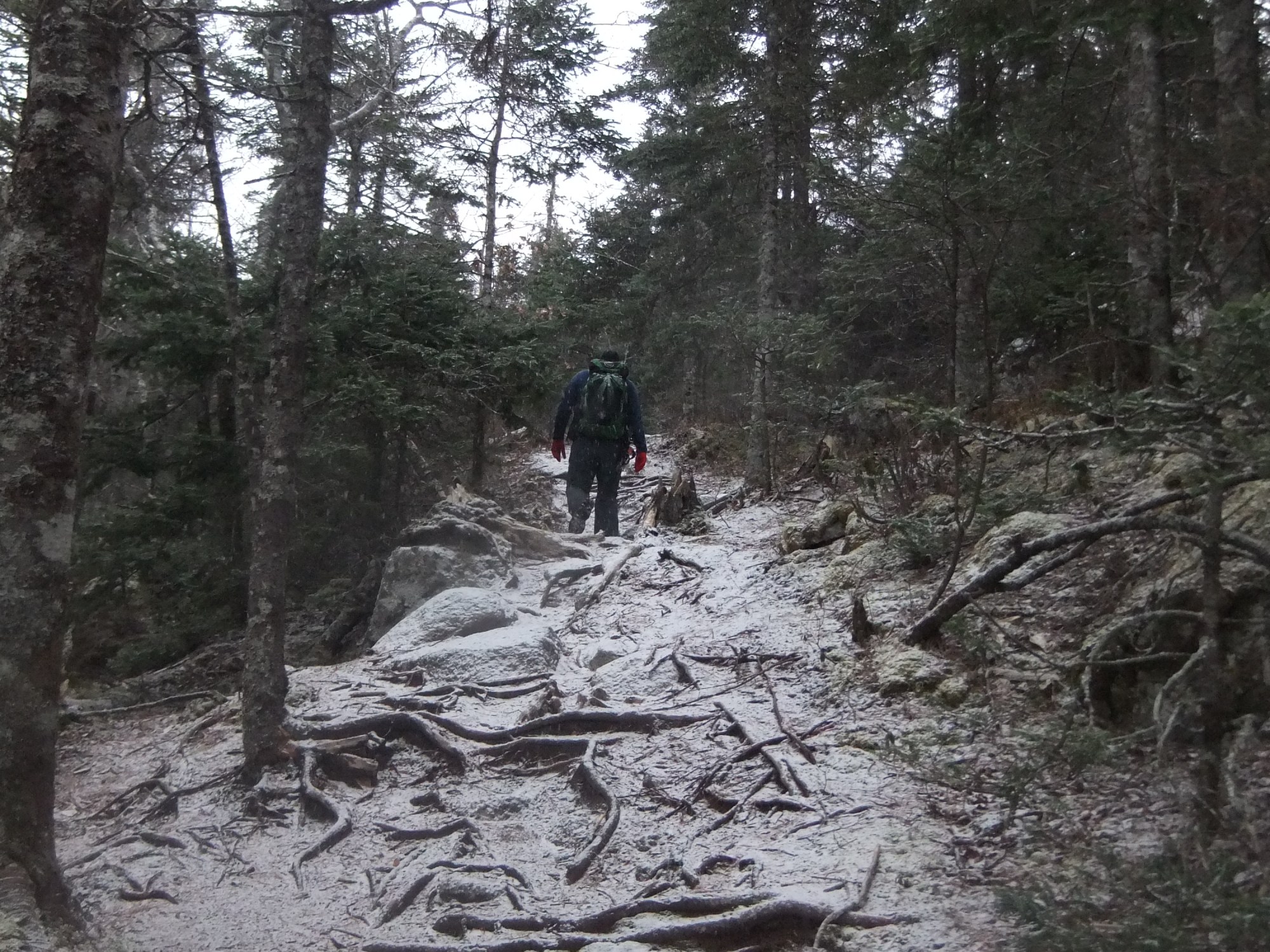 The light dusting of snow made the end of the hike treacherous by obscuring the ice patches. Despite numerous slips (and one fall) we escaped serious injury. Lesson learned – it’s always worth stopping to take the time to put the icers back on BEFORE you actually think you need them.