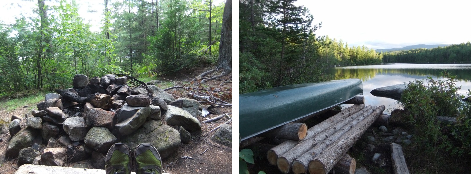 Blueberries were definitely the most memorable part of the walk to Pogy Pond, but we do remember that the final approach to the lean-to was a bit deceptive. You briefly see the pond but then lose sight of it as you are walking along its west edge, so that we wondered a few times whether we had missed the turnoff to the lean-to. Again, we needn’t have worried – the trail was well-marked. Once we arrived… what a place! The lean-to itself was one of the smaller older style ones. It had a great fire ring built just outside and some drying wood stashed underneath. The outhouse was definitely well-ventilated.