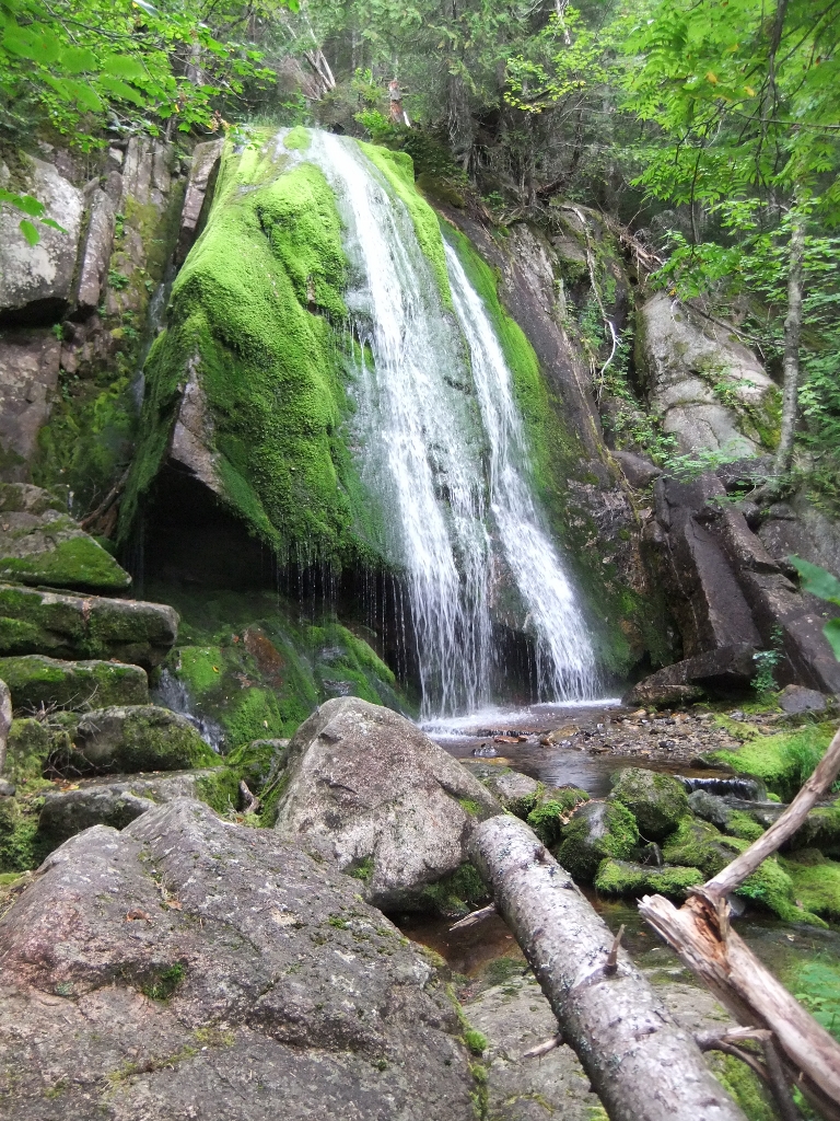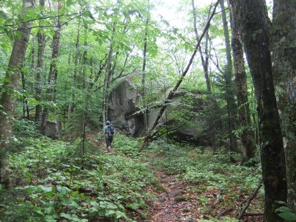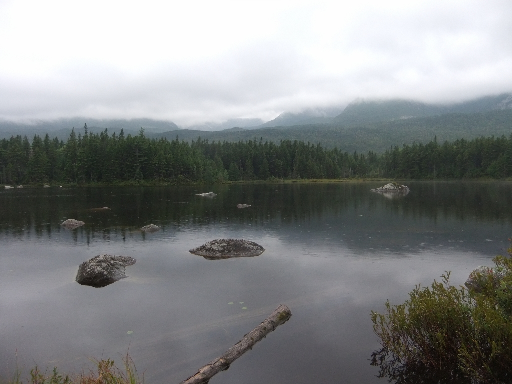 The sun had disappeared and the skies opened up as we stepped out of the shuttle. There were lots of other hikers milling around when we signed in at the ranger’s cabin. We waited on the covered porch for the heavy showers to pass, but after about half an hour decided we would just head out anyway, since it was a short day and some variety of rain was forecasted until dark. We made it about 20 paces before a voice called out from the covered porch of a nearby cabin asking where we were headed. Turns out it was the rangers from Chimney Pond (Ranger Mark again!) and Russell Pond. Armed with knowledge of the local weather report they told us that the worst of the storm would pass in the next 20 minutes. They invited us to wait on the porch with them and we had a great chat while we watched the rain turn into a blinding downpour with huge claps of thunder and bright lightning. The intense weather blew by about 20 minutes later, right as they predicted. It was an intermittent light drizzle when we set out walking, glad that we had avoided a thorough drenching right at the beginning of our first day. The ranger headed to Russell Pond quickly left us in the dust as we ambled along and explored a few short detours along the way.