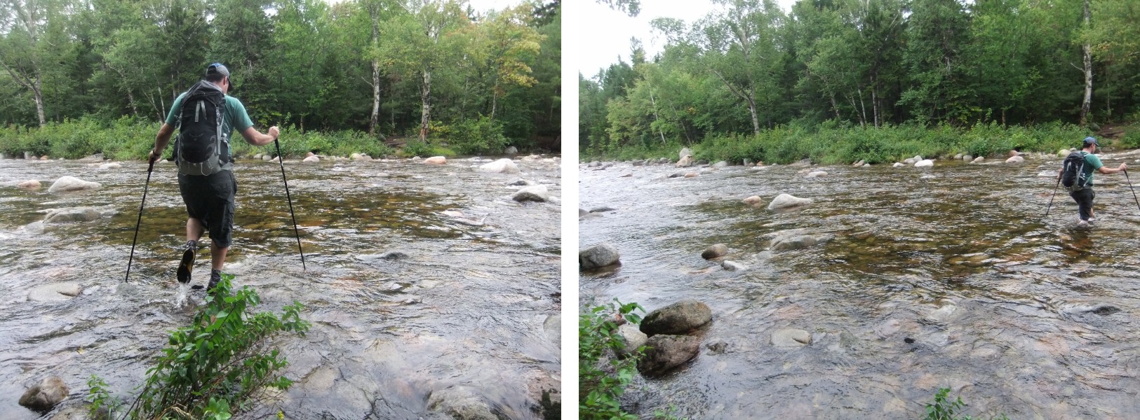 We had talked to the ranger in detail about what to expect crossing Wassataquoik Stream, but when we arrived the water seemed higher and faster than his description. Apparently he was surprised as well – he told us later that evening that he’d even paused to contemplate waiting for us, but decided we’d be OK. It just goes to show how quickly and unpredictably conditions can change. Coincidentally, just a few weeks before, we’d gathered with a group to discuss and practice various techniques for water crossings. We took some time to study the water to choose our route, then set out with loose packs, careful pole placement, and slow steps to the other side.