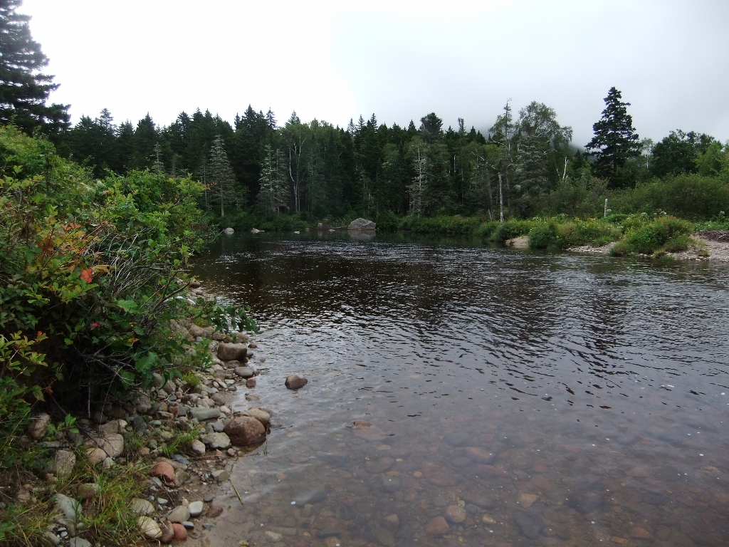 We were going to begin this day with a loop out to Grand Falls before returning to Russell Pond and heading out for Pogy Pond. It was still grey and drizzling as we set out. We passed near the Wassatoquoik Stream lean-tos, which are hidden in the trees in the photo below. This is the only place where there are two lean-tos in close proximity in the backcountry.