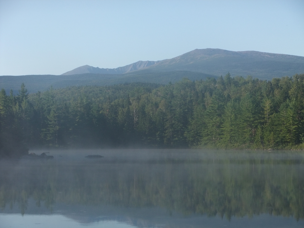 When we awoke in the morning we just had to walk back down to the lake for one last look. At first we were simply enjoying watching the steam rise off the water when we realized we could see the Knife Edge off to our left! We didn’t pick it out through the cloud cover the day before. Just a little parting gift from Pogy Pond.