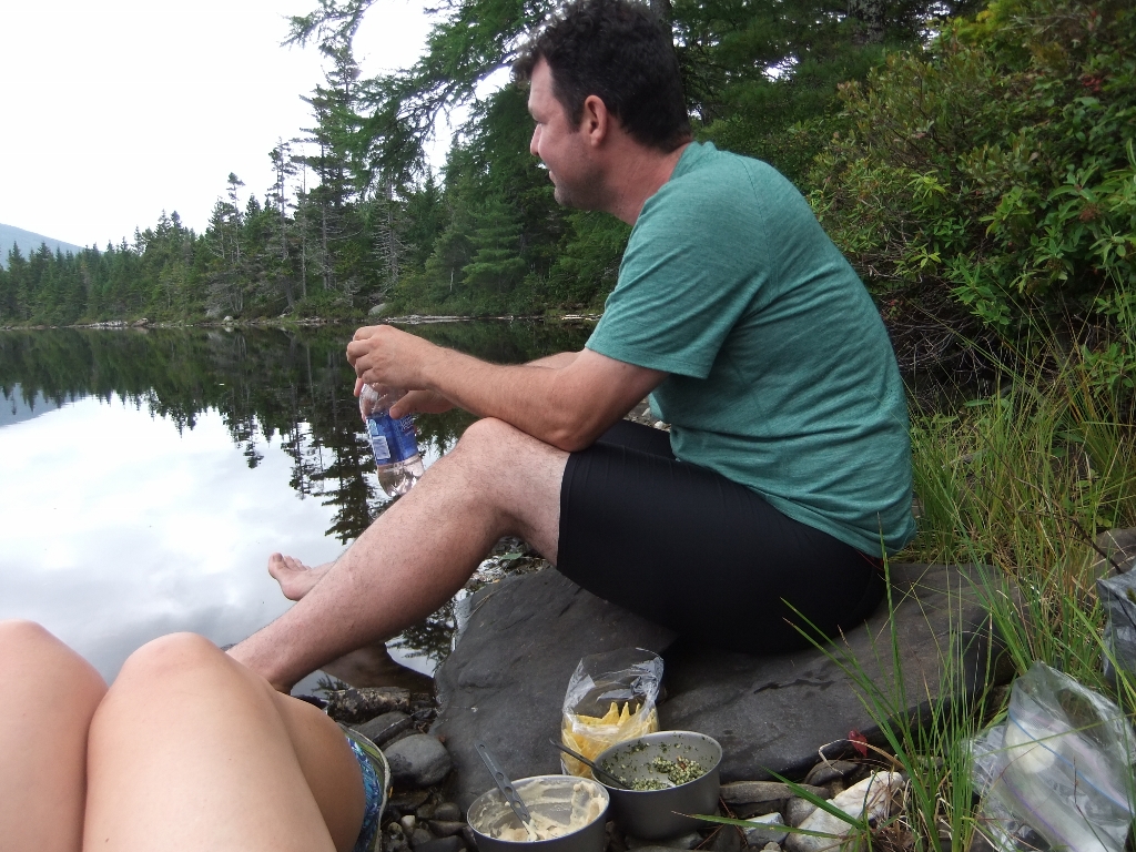 There were some flies in this area, and we had been thinking that if there was no one at the new Center Pond lean-to we would take out the canoe and eat lunch drifting in the pond. We’d read the park’s story about building the lean-to and were curious to see it for ourselves. As we approached we saw hanging gear, so we quietly retreated to find a spot along the edge of the lake. It was here that we ran into a couple who told us they were on an End-to-End traverse of the park from the South Gate to the North Gate. Now that is an adventure! We chatted for a bit and then they walked on past us to the lean-to while we stopped to eat. On their way back they reported that it wasn’t actually other people at the lean-to, but lifejackets stuffed under the eaves that we had seen. Oh well, it was a nice lunch anyway. Dehydrated hummus, tabouli and corn chips for starters!