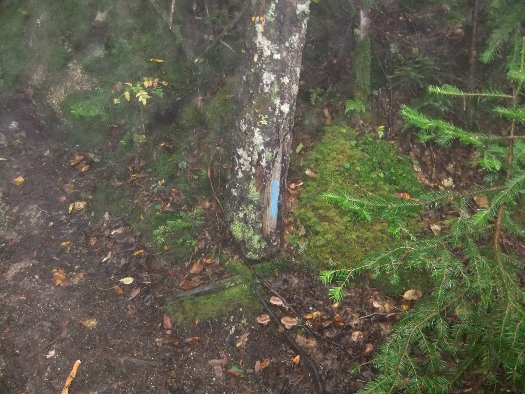Doubletop starts steep and stays steep. In places the blazes were painted on trees only a few inches above the ground, which ends up being at eye level while climbing. We were both pretty tired and it was very slow going. We were watching the altimeter on my wristwatch and stopping at regular intervals. That little mental game was the only thing that kept us going in a few places. Though it was now daylight, the fog was getting thicker as we climbed.