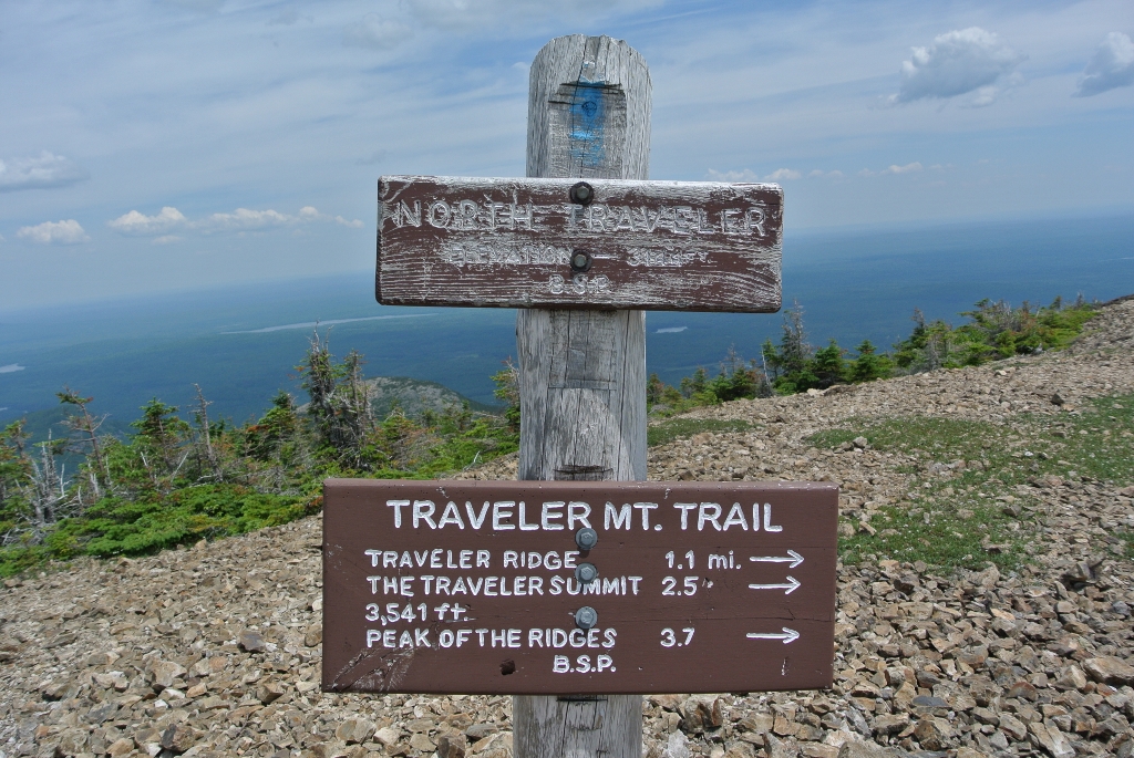 We followed the guide book recommendation to hike the Traveler Loop in a counter-clockwise direction. The recommendation seemed to be mostly based on avoiding descending over loose rock on Center Ridge trail. After doing the loop, we’re not convinced that we would’ve been any worse for the wear going the other way. There is loose rock on Center Ridge and it would be a challenging descent, but there were loose and slippery sections coming down from North Traveler too. We mention this because the counter-clockwise recommendation had been throwing a wrench in our plans to try to include Traveler Loop in a backpack from South Branch to Katahdin Stream campground.
