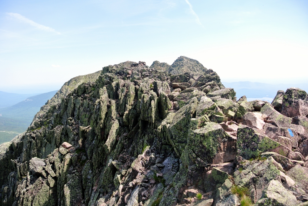 We stopped for a few minutes at Pamola Peak and chatted briefly with another couple before they set out ahead of us toward the Knife Edge. They were motoring right along. We caught up to them again heading up the Chimney and overheard part of a conversation about the difficulty of the trail…