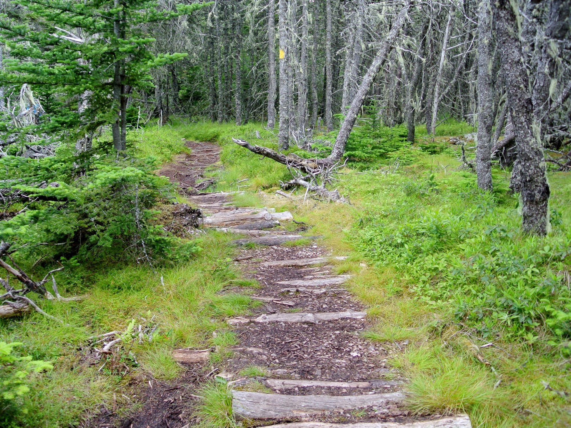 Once you reach the end of the sandy beach and step up over a small bit of rocky shoreline, the trail is easily followed up a small incline through a forest showing generational transition of the trees. The trail is clearly blazed with yellow paint.